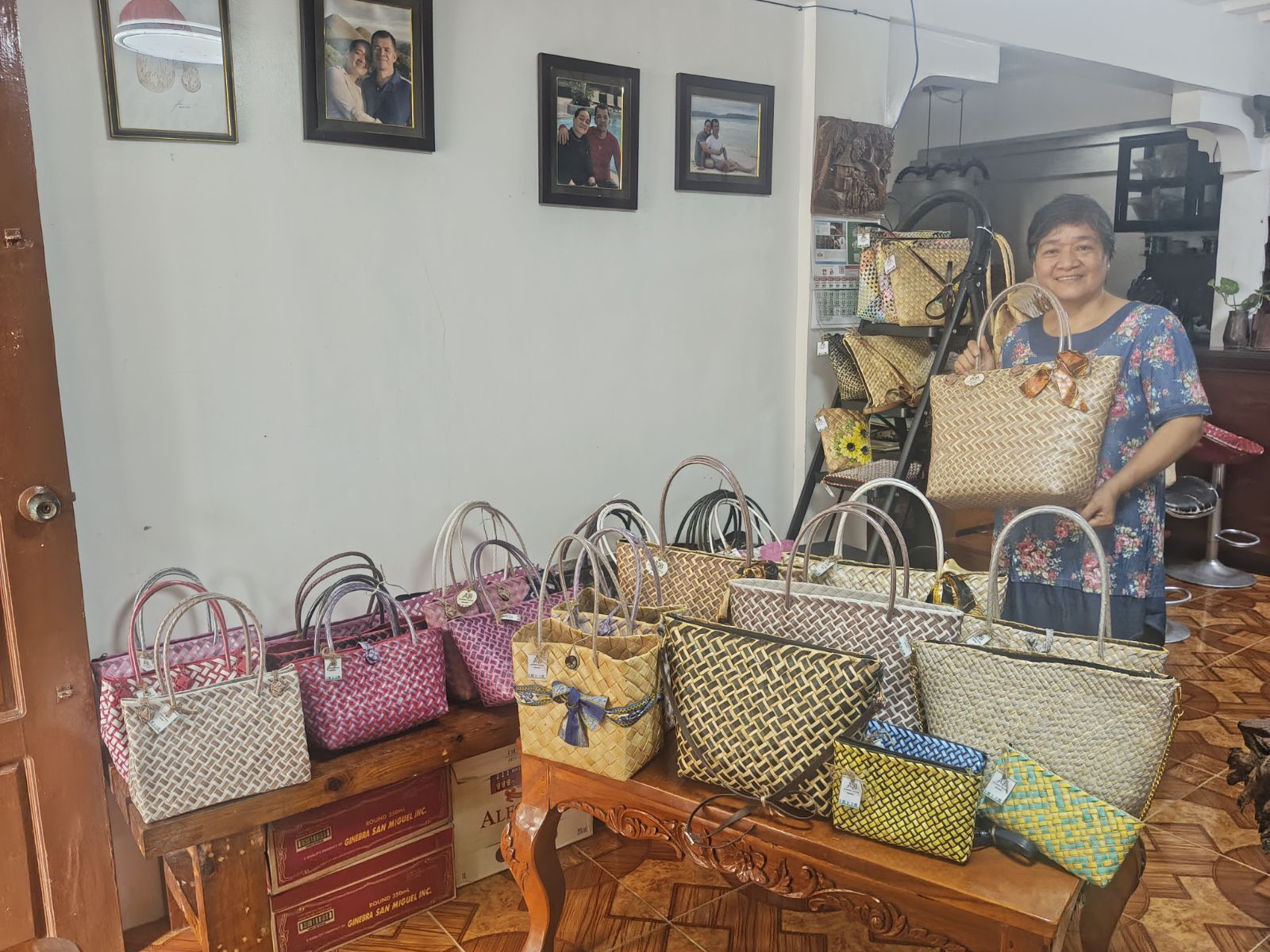 Eleodora Carreos from Calamba City, Laguna, proudly showcases her beautifully handcrafted woven bags.