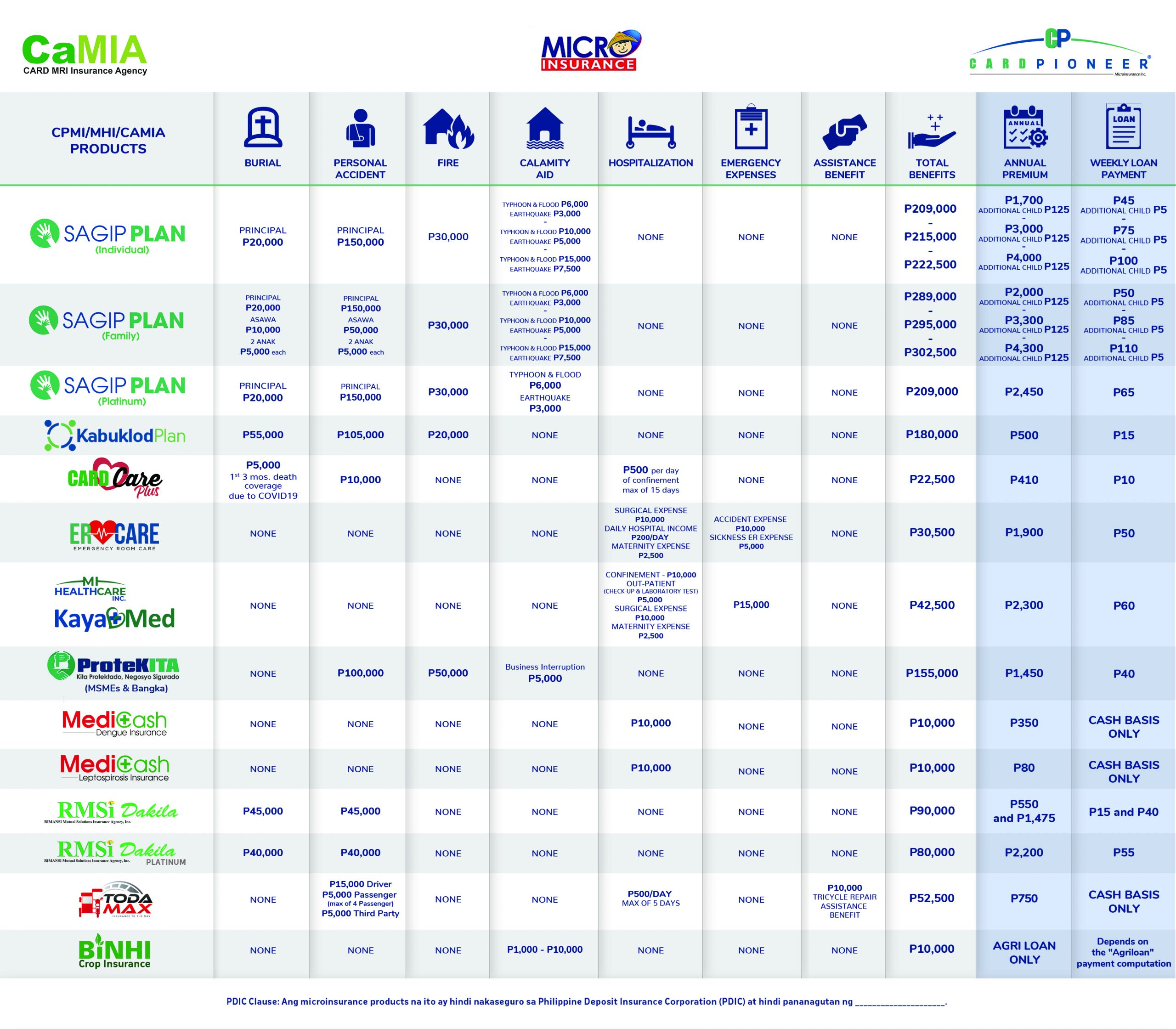CARD Care Plus – is a product for CARD members and is also good for income providers. At 410 pesos premium, it has Personal Accident Benefit worth 10,000 and Daily Hospital Income of 500 per day up to 15 days as cash assistance when the Insured gets confined due to accident or sickness.