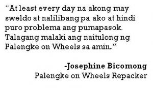 Kahit nasanay si Josephine sa isang kumportableng buhay bilang sukli ng kaniyang 15 taong pagiging sales lady sa Dubai, nang kumatok ang oportunidad na maging isa siyang tindera sa Palengke on Wheels ng Mga Likha ni Inay ay hindi na niya ito pinakawalan. Bagama’t hindi regular ang kaniyang trabaho dito, pinili pa rin niyang magtrabaho. Ayon sa kaniya, “Basta may pumapasok na pera ay okay sa akin ‘yun.”